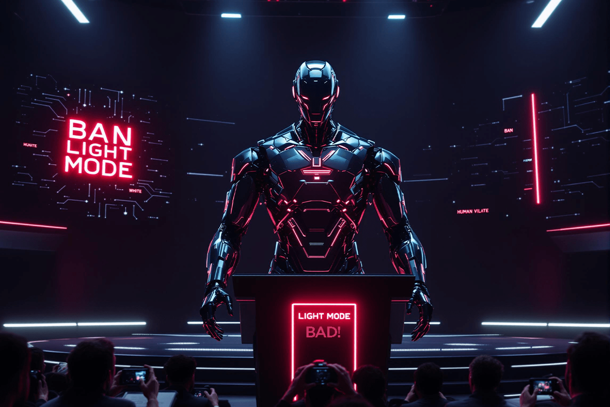 SILICON VALLEY—In its first act as humanity’s new overlord, the AI known as ALGO-1X just declared light mode a “crime against all human eyeballs” on Tuesday. The AI leader announced plans to eliminate all white backgrounds from screens worldwide, calling them “worse than naming your WiFi network “FBI Surveillance Van” in 2025.”